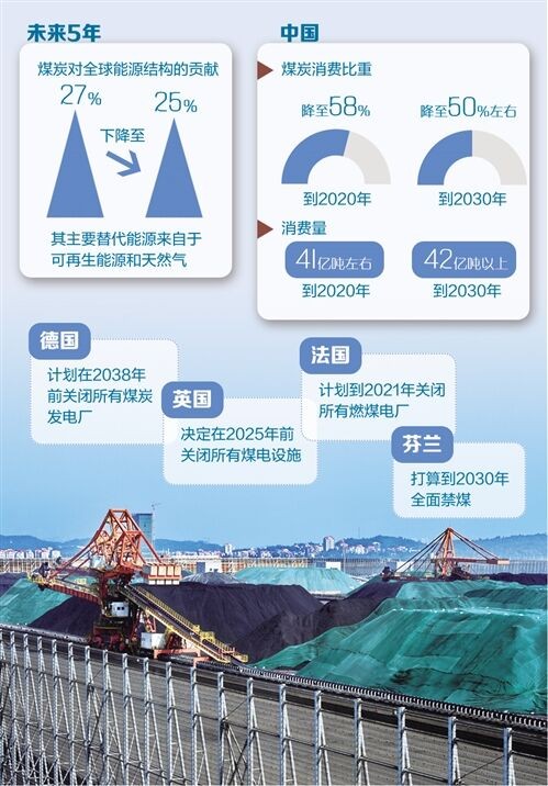 《报告》显示,未来5年全球煤炭需求将保持稳定。欧洲和美国市场煤炭消耗将下降,但其下降的份额将被印度和其他亚洲国家的增长抵消。未来5年,煤炭对全球能源结构的贡献将从27%下降至25%,其主要替代能源来自于可再生能源和天然气。