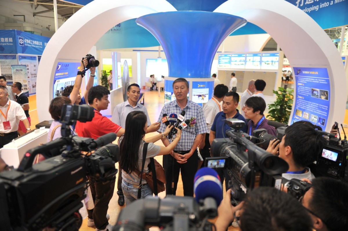 吉尔吉斯共和国地质矿产资源蜀国务秘书苏坦诺夫在矿博会会场接受媒体采访