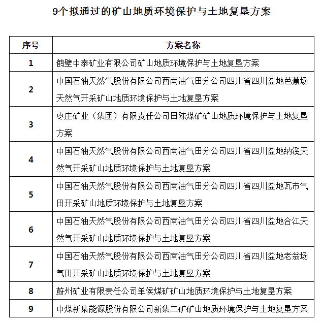 根据《土地复垦条例》《矿山地质环境保护规定》和《国土资源部办公厅关于做好矿山地质环境保护与土地复垦方案编报有关工作的通知》(国土资规〔2016〕21号)有关要求,我部委托自然资源部国土整治中心组织专家对2019年12月31日前受理的鹤壁中泰矿业有限公司等9个企业编制的矿山地质环境保护与土地复垦方案(以下简称“方案”)进行了审查。现将拟同意通过的9个方案和专家评审意见进行公示,公示期为自发布之日起7个工作日。