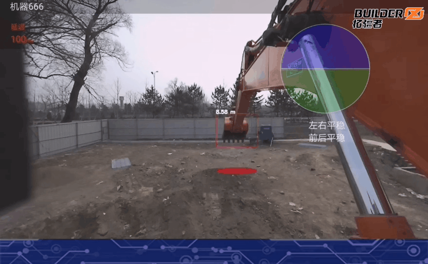 挖机在现场运作,现场画面展示在显示器上。“拓疆者”结合AR技术,计算挖斗在地面上的垂直投影,并将其标注为红点。有了参照物,空间感立刻大大增强。