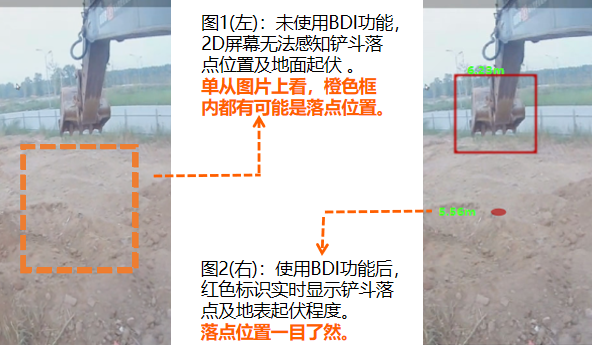 BDI功能采用AR、AI等技术,通过机器学习海量的施工现场图片,实现了精准确定目标位置,可视化呈现现场环境,增强空间感,让司机在操作过程中能够更方便、更直观地进行施工作业,大大提升了工作效率。