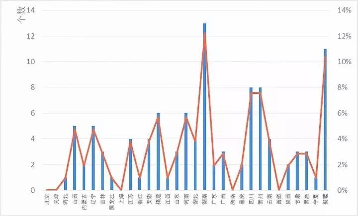 由表1和图2看出,除北京、天津、上海、海南、西藏外,其他26省份均提出了绿色矿业发展示范区建设。湖南和新疆最多,分别为13个和11个;其次为四川、贵州、福建、河南、山西,数量分别为8个、8个、6个、6个、5个,7省份绿色矿业发展示范区占示范区总数的50%左右;其他省份绿色矿业发展示范区数量相对较少。这说明不同省份绿色矿业发展示范区建设理解和重视不同。