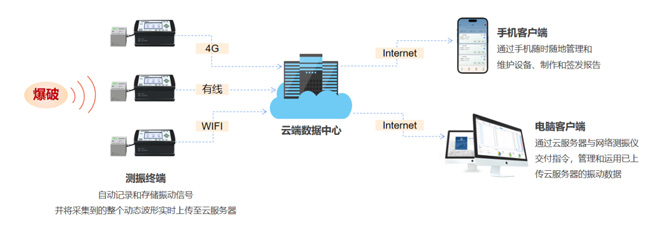 在爆破实施前,固定好传感器并连接仪器,打开仪器电源即可离开现场,仪器即进入工作状态;当各炮次的振动信号传来时,仪器会自动记录和存储振动信号,并将采集到整个动态波形实时上传至数据中心;在各炮次起爆后几分钟,用户在异地通过客户端对已上传的数据进行分析,根据需求制作相应类型的报告。
