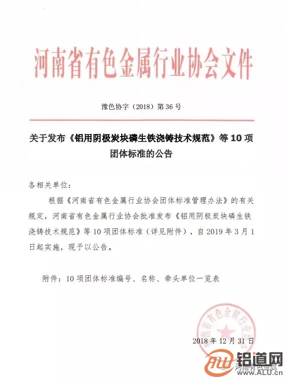 为推动有色金属行业持续健康发展,根据《河南省有色金属行业协会团体标准管理办法》的有关规定,河南省有色金属行业协会2018年完成了一批团体标准的制定、审查等工作,并于近日发布了《铝用阴极炭块磷生铁浇铸技术规范》等10项团体标准。这10项团体标准自2019年3月1日起实施。